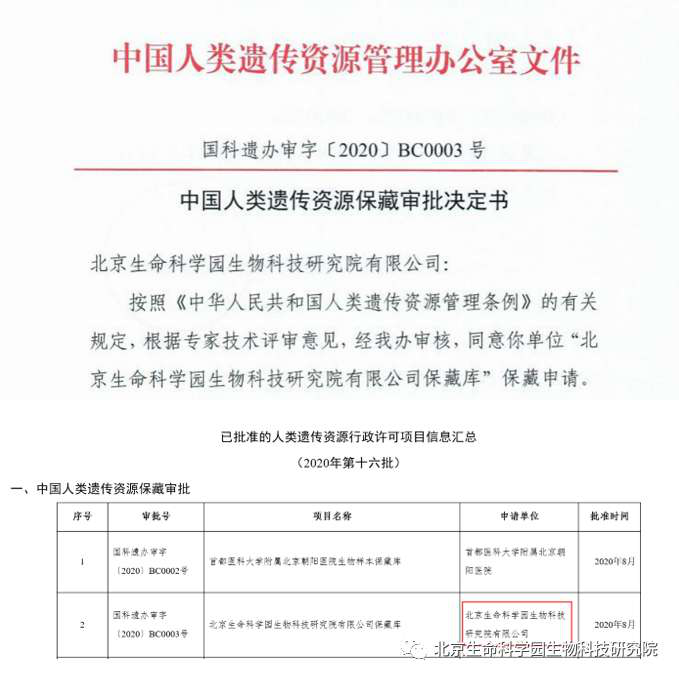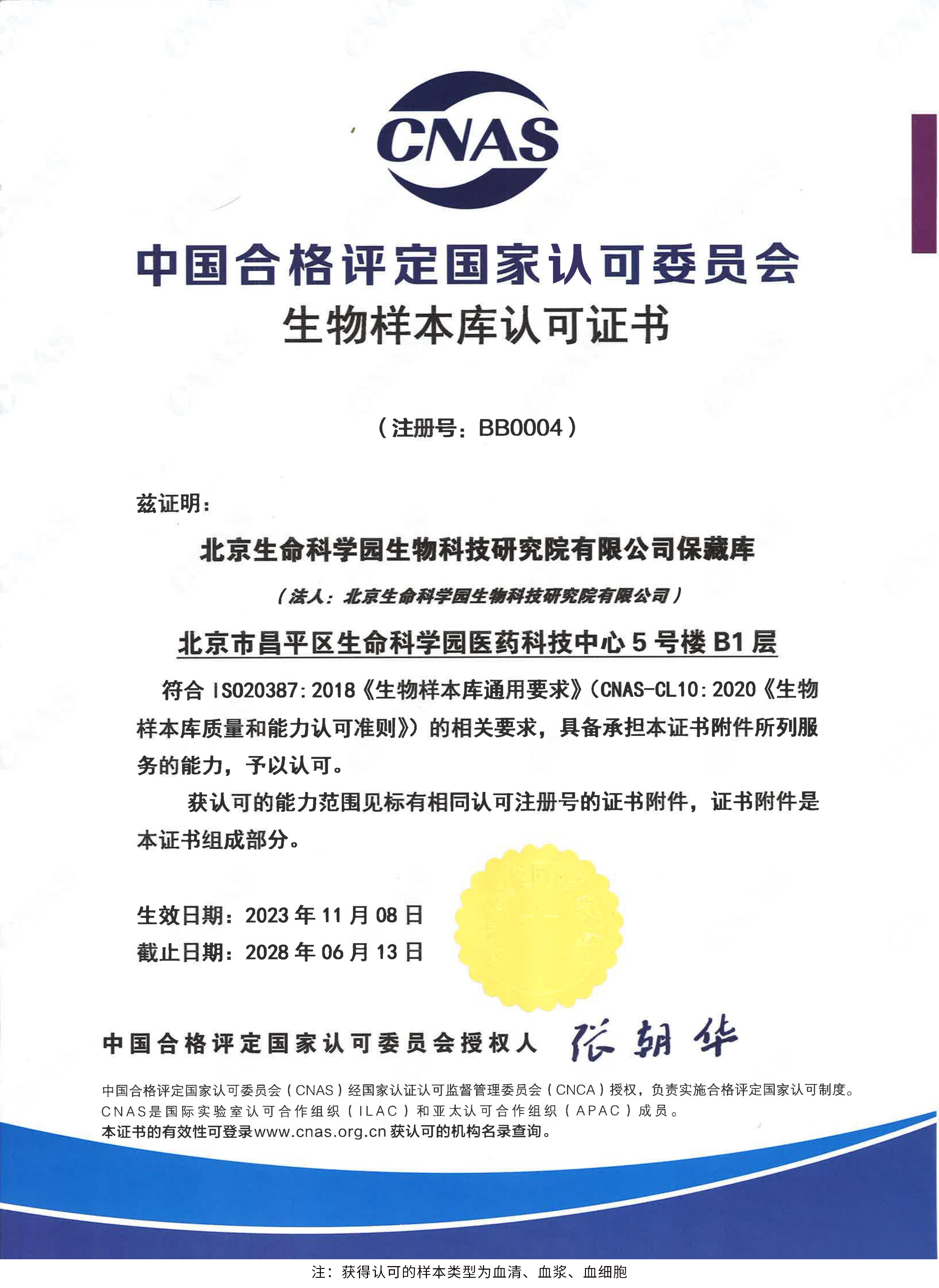 北京生命科學園生物科技研究院(以下簡稱“北京生物樣本資源庫”)(Biobank of Life Science Park,簡寫“BoLSP”)是一家由北京市科委和中關村生命科學園共同支持設立的第三方生物樣本庫公共服務平臺,秉承北京重大疾病臨床數據和樣本資源庫(以下簡稱“北京庫”)(Beijing Biobank of Clinical Resources,BBCR)十余年的發(fā)展成果,聚合眾多臨床樣本專家的專業(yè)共識,致力于在生命科學、生物醫(yī)藥研究領域發(fā)揮銜接樣本資源持有者與研究者的橋梁作用,解決生物樣本資源開發(fā)上下游信息不對稱、資源共享困難等問題。研究院在北京中關村生命科學園昌平園區(qū)建立了2000㎡生物樣本庫,最大存儲規(guī)模達1000萬份。研究院遵循CNAS-CL10:2020《生物樣本庫質量和能力認可準則》,同時結合北京庫過去十年的工作經驗與教訓,建立了一套完善的生物樣本保藏質量管理體系,從人、機、料、法、環(huán)、控多個角度,實現生物樣本保藏過程的全面質量控制,先后獲得國家科技部頒發(fā)的人類遺傳資源保藏行政許可證書和中國合格評定國家認可委員會(China National Accreditation Service for Conformity Assessment,CNAS)頒發(fā)的“CNAS認可證書”。